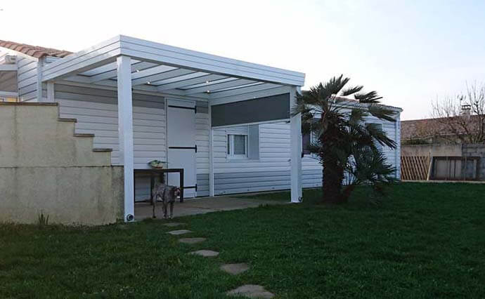 Sa toiture peut se décliner avec plusieurs types de matériaux, mais compte tenu de la faible pente de sa toiture, nous vous conseillons du polycarbonate opale Athermique ou du simple vitrage feuilleté opale.