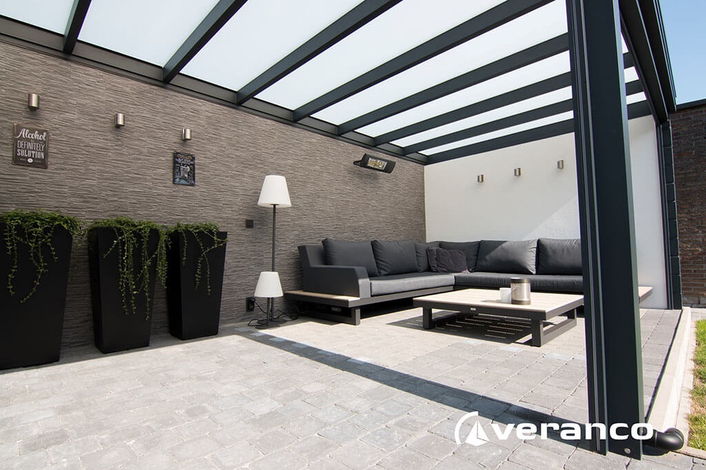 Son chéneau périphérique plat lui permet de recevoir tout naturellement des stores screens pour fermer partiellement ou entièrement cet espace. Idéale, par exemple, pour protéger un SPA des courants d'airs, des regards indiscrets et du soleil.
